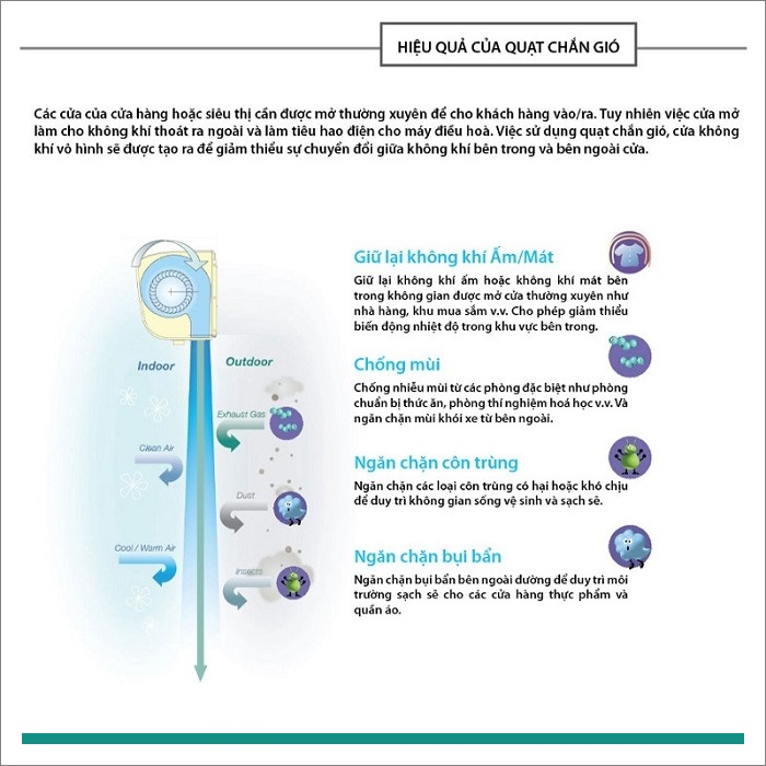 Quạt chắn gió điều hoà tạo ra một luồng gió mạnh từ trên xuống, giống như một chiếc rèm thông minh ngăn giữa hai luồng không khí. Không khí mát lạnh bên trong nhà, các quán ăn, trung tâm thương mại….sẽ được giữ lại. Đồng thời quạt chắn gió điều hoà sẽ ngăn cản luồng khí nóng bên ngoài, cũng như bụi côn trùng không cho xâm nhập vào nhà. Chính vì vậy sử dụng quạt chắn gió điều hoà mang lại hiệu quả nhất định.